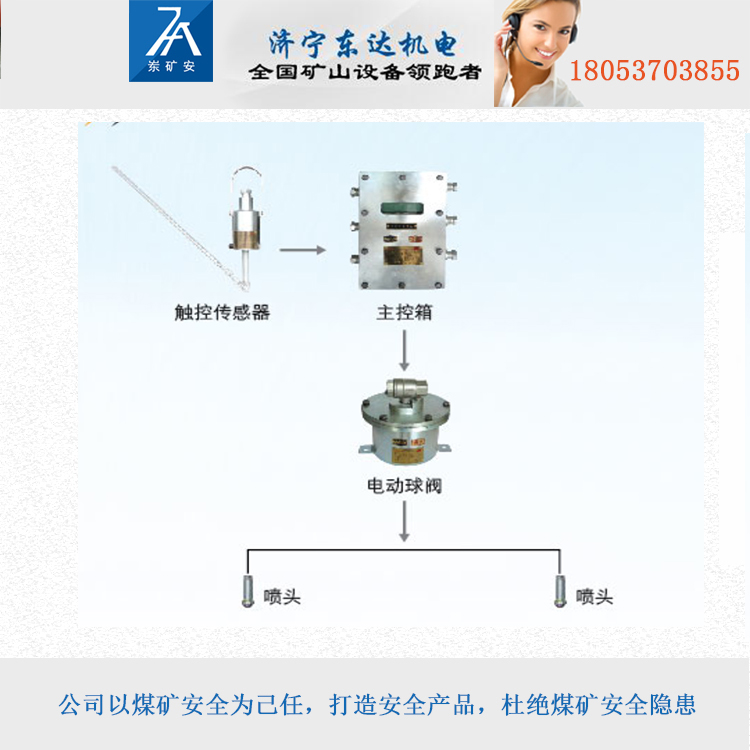 皮带运输机输煤时,煤流触动传感器探杆,触控传感器接收到信号触发主控箱控制电路并打开电动球阀,装置自动喷雾降尘,无物料时延时一段时间(延时可调)后停止喷雾。
