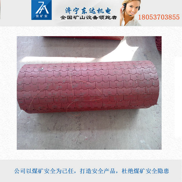 锰钢甲带又称钢带、履带,是甲带式给煤机传动部分中主要配件,甲带选用由增强尼龙1010高耐磨轴销串接新型甲片组成。新型甲片为精密铸造,材质为Mn16或高耐磨合金钢。Mn16材料具有良好的耐磨性、韧性,增强尼龙1010穿条具有良好的耐磨性和自润滑性,大大提高了甲带的耐冲击性,当甲带受到物料剧烈冲击时,首先其自身结构形式就将冲击力由冲击点甲片经甲带尼龙穿条向四周扩散,其次,其下的胶带自身变形也吸收一定的冲击载荷。并同时将剩余的冲击载荷传导给缓冲托辊及缓冲托辊座进行吸收,这样就很好的提高了给煤机的抗冲击力。