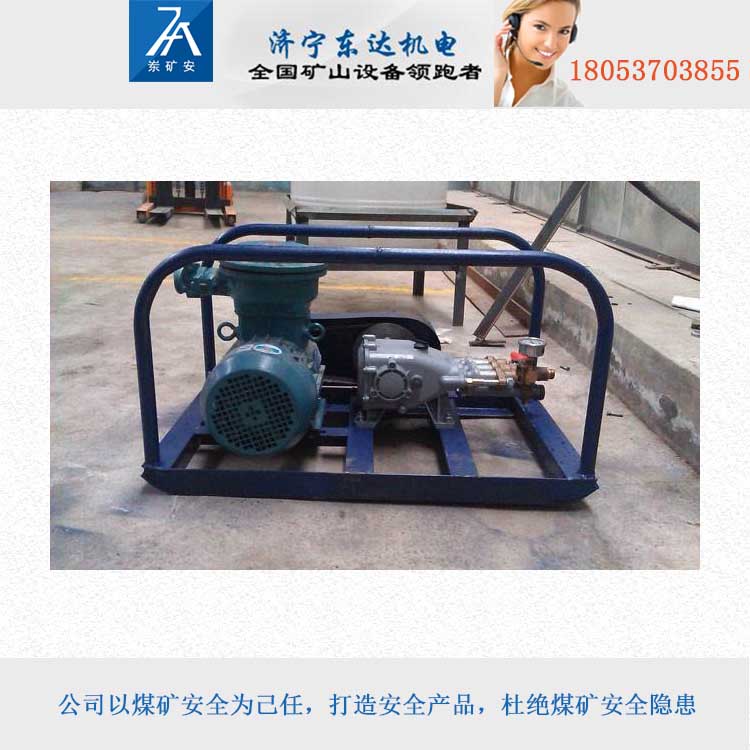 BH-40/2.5矿用液压灭火泵(即原型号为WJ-24-2)阻化多用泵、阻化剂喷射泵:主要用于煤矿井下喷洒阻化剂溶液防止煤炭自燃发火。适于采煤工作面采空区浮煤喷洒阻化剂防火或高冒顶插管压注阻化液防火, kW 380/660V防爆电机和三缸液泵组成,泵曲轴转动一周可进行三次吸水和排水,可由柱形压力表显示泵压。