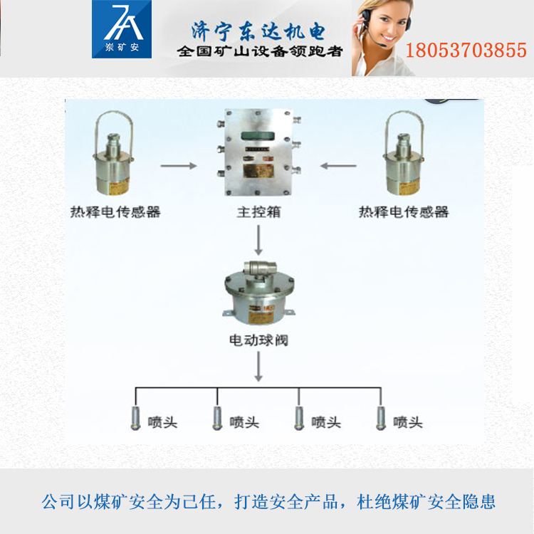 使用在放炮作业场所时配置主控箱、内置声控传感器、内置触控传感器各1台、电动球阀1台(爆破迎头风水远程自动喷雾降尘时用电动球阀2台)、充电器1台。