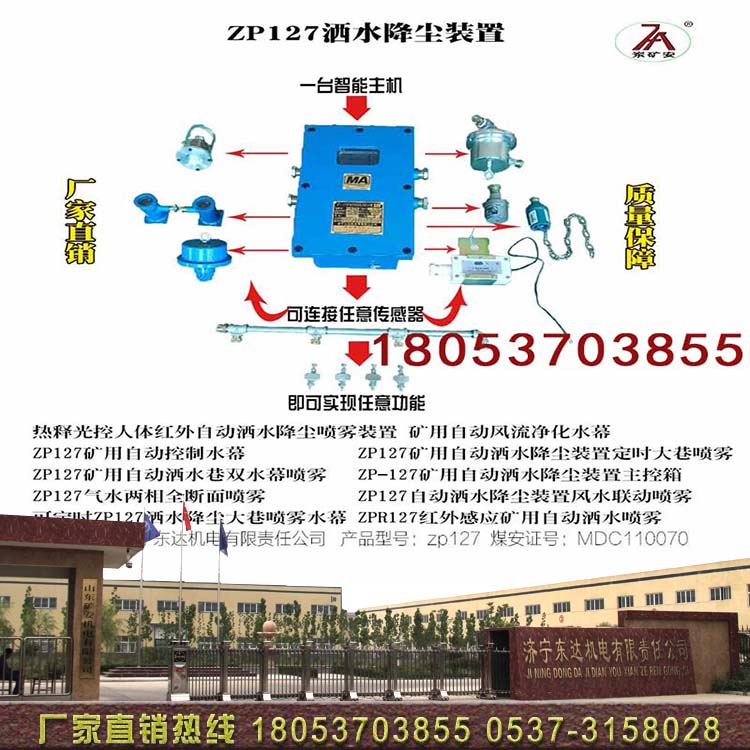 ZP127矿用自动洒水降尘装置由ZP-127S洒水主控箱,DFB-20/7防爆电磁阀(电动球阀),传感器,高压胶管和喷头组成。