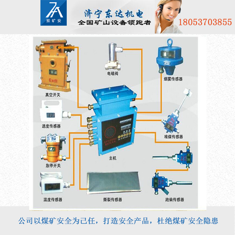 皮带机正常运行时,矿用皮带机保护装置GEJ30跑偏传感器的接点断开,当某处皮带跑偏,触及跑偏传感器导杆时并偏转一定角度时,传感器内接点闭合,主机跑偏指示灯亮,主机执行继电器释放,矿用皮带机保护装置GEJ30跑偏传感器实现跑偏保护,同时发出语言报警信号。皮带机综合保护装置包括智能主机、张紧力下降保护装置、温度传感器等。